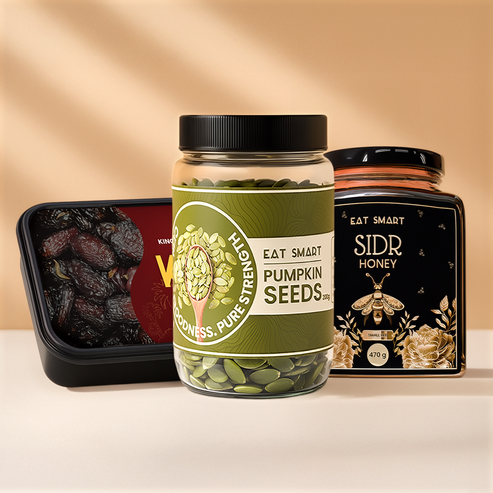The Premium Iftar Bundle is a thoughtfully curated Ramadan pack designed to bring quality, taste, and nutrition to your Iftar table. Featuring premium Sidr honey, Kalmi dates, and nutrient-rich pumpkin seeds, this bundle is perfect for daily Ramadan use and gifting.